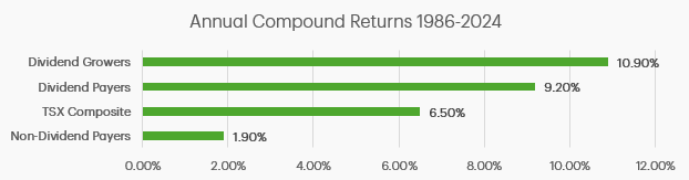 According to RBC Capital Markets Quantitative Research, companies that pay and grow their dividends had the best overall returns between 1986 to 2024: